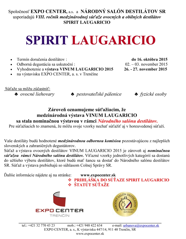 Neodmysliteľnou súčasťou výstavy VINUM LAUGARICIO je odborný sprievodný program, ktorému dominujú súťaže - 9. ročník súťaže Šampión výstavy VINUM LAUGARICIO v sekcii vína pod vedením uznávaného odborníka prof. Ing. Fedora Malíka, DrSc., ktorý je tvorcom moderného vinárskeho povedomia Slovákov a 8. ročník medzinárodnej súťaže ovocných a obilných destilátov SPIRIT LAUGARICIO, ktorý je zároveň nominačnou súťažou v rámci Národného salónu destilátov. |