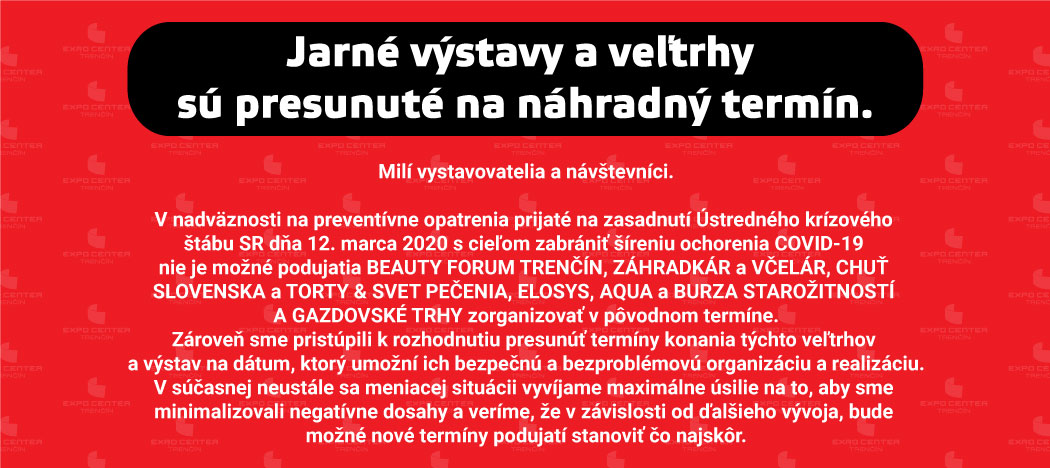 v nadväznosti na preventívne opatrenia prijaté na zasadnutí Ústredného krízového štábu SR dňa 23.3. 2020 s cieľom zabrániť šíreniu ochorenia COVID-19 bohužiaľ nie je možné zorganizovať podujatie AQUA 2020 v pôvodnom termíne 9.6.-11.6.. Pristúpili sme k rozhodnutiu presunúť termín konania veľtrhu na dátum, ktorý už, veríme, umožní jeho bezpečnú a bezproblémovú realizáciu, a to na 29.9.-1.10. 2020.